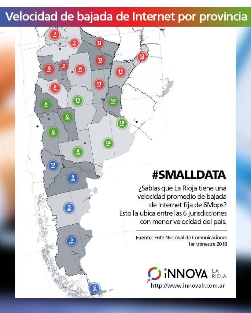 ¿SABES CUÁL ES LA VELOCIDAD PROMEDIO DE INTERNET EN LA RIOJA? iNNOVA 10/09/201824/05/2021Deja un comentario on ¿SABES CUÁL ES LA VELOCIDAD PROMEDIO DE INTERNET EN LA RIOJA? La Rioja tiene una velocidad promedio de bajada de Internet Fija de 6 mbps. Esto la ubica entre las 6 jurisdicciones con menor velocidad del país. Compártelo:TwitterFacebookLinkedInWhatsApp